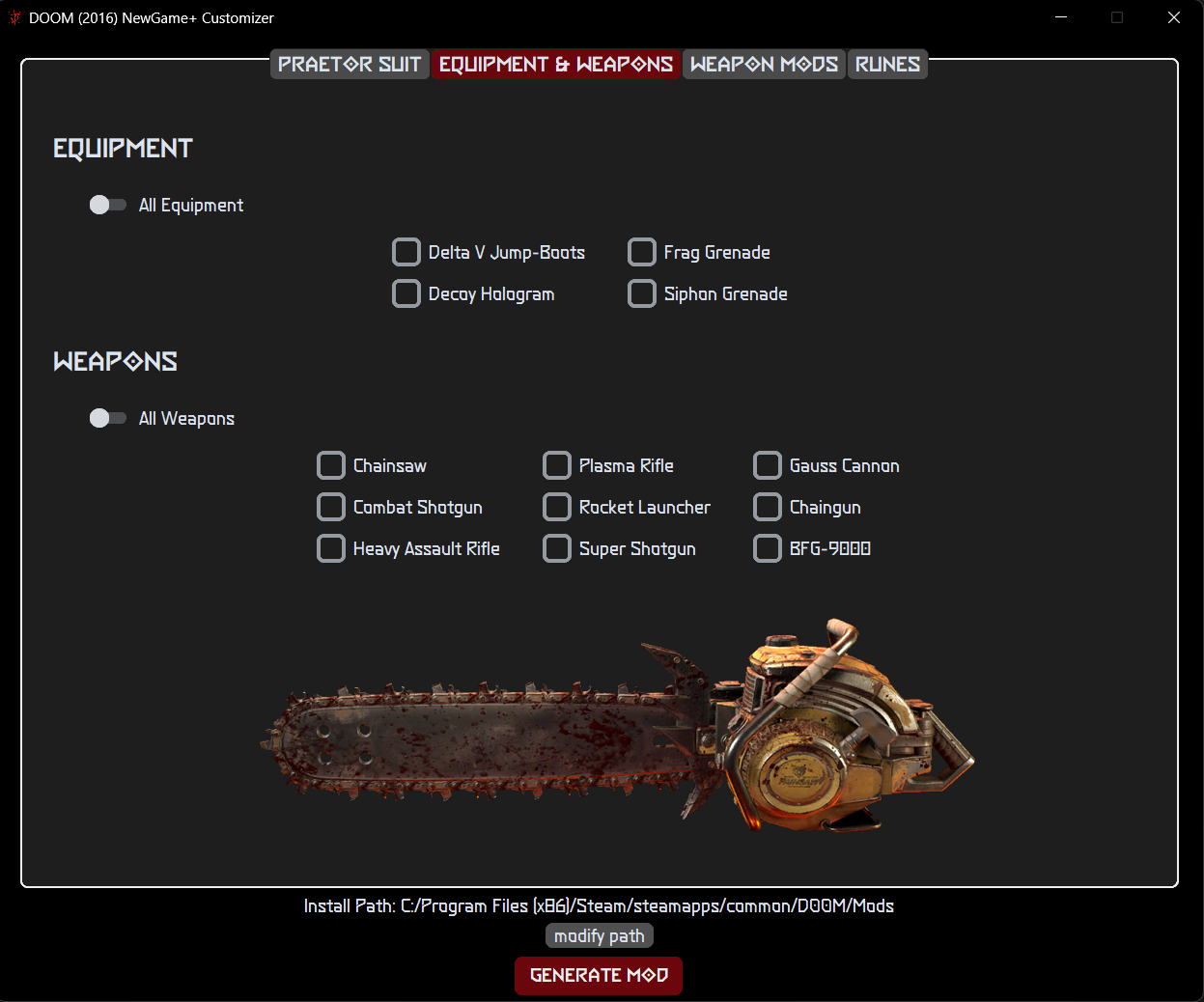 A mod utility program that generates a .decl file (idTech file format) for DOOM (2016) to read from at new game start, allowing the user to simulate a “new game plus” feature by starting with most any desired combination of inventory items (equipment, weapons) and player upgrades already acquired.