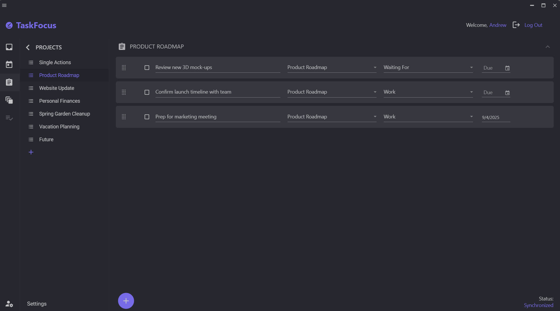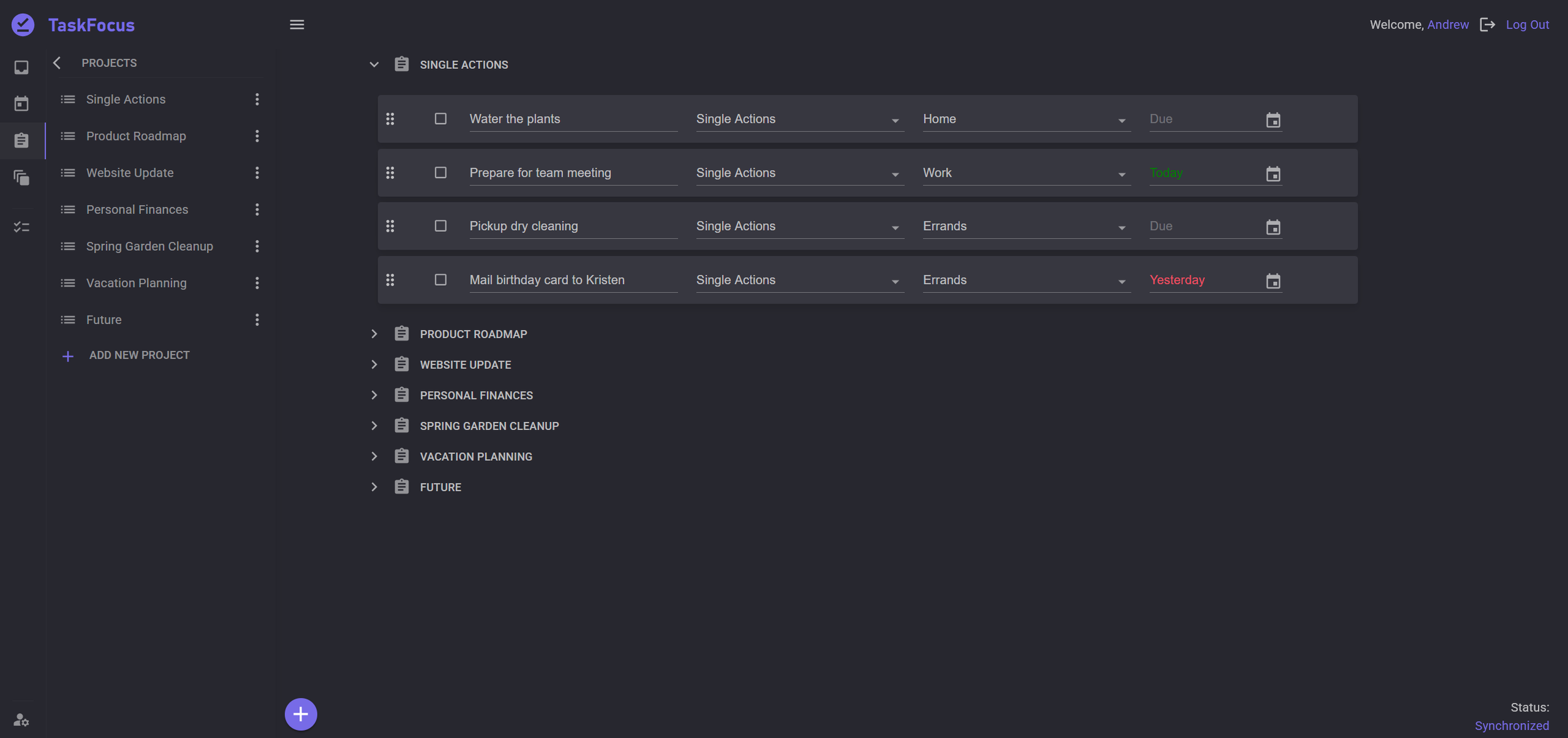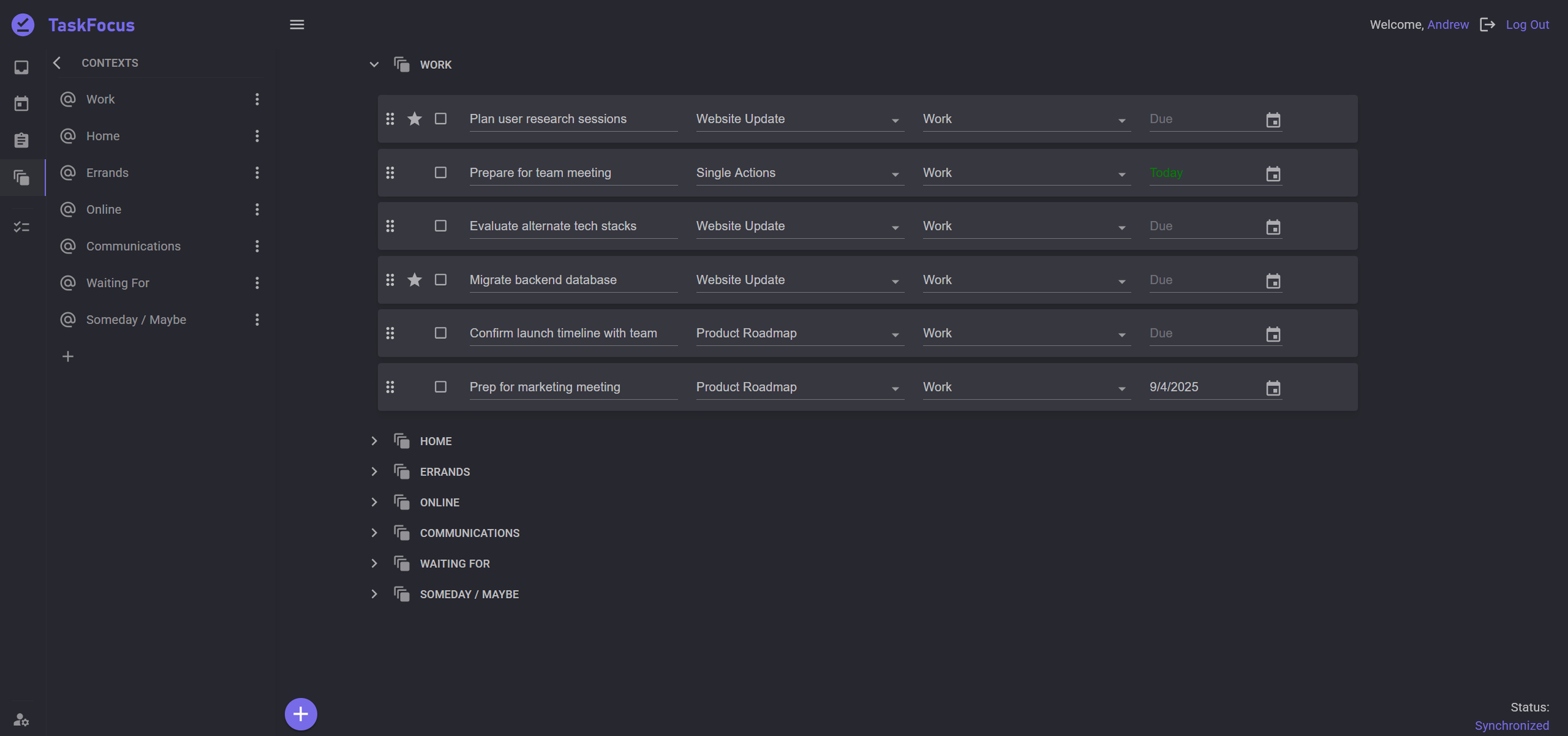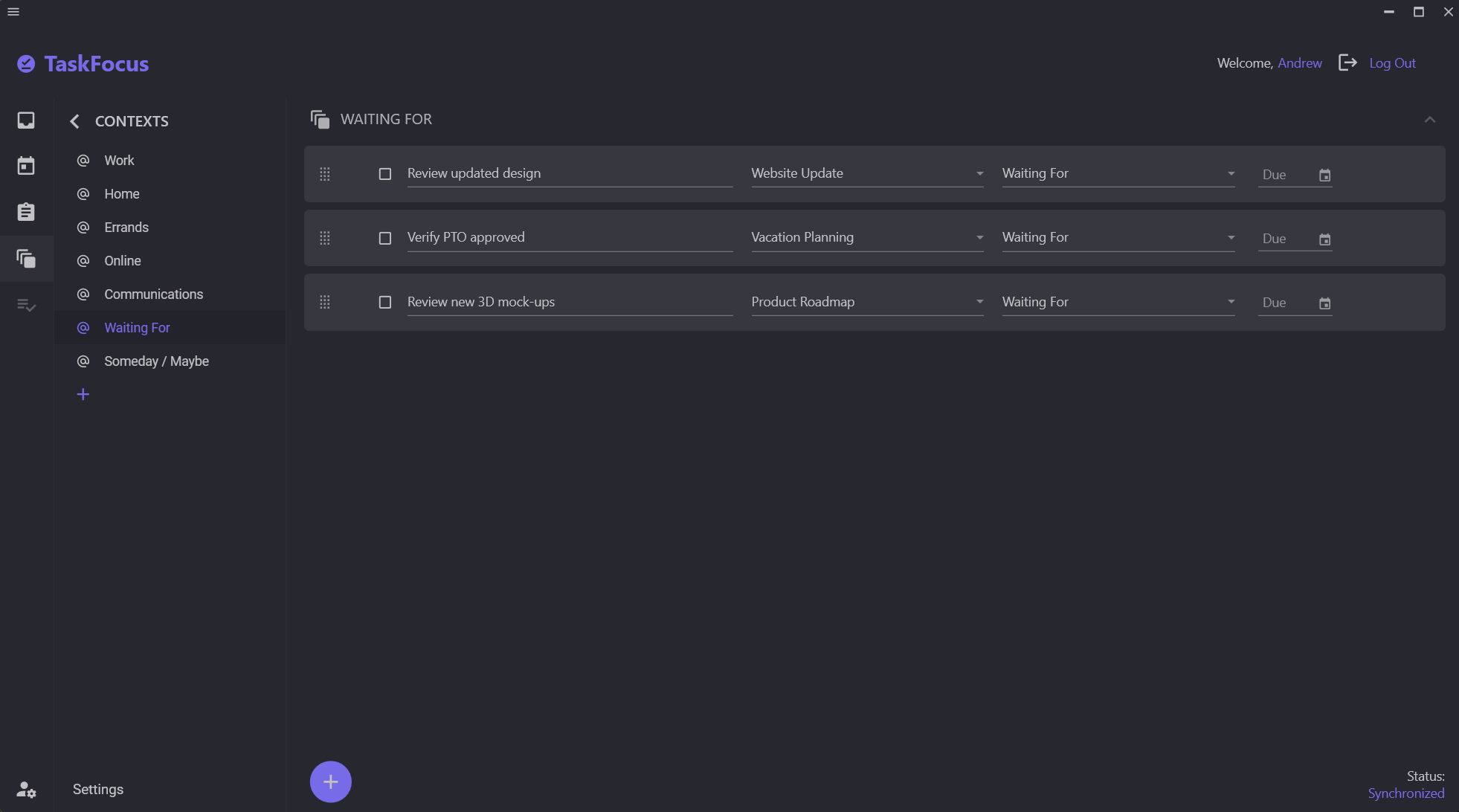Users can create and organize task data, which is synced between the web and desktop apps. Following the GTD productivity system, tasks can be assigned both projects and contexts: